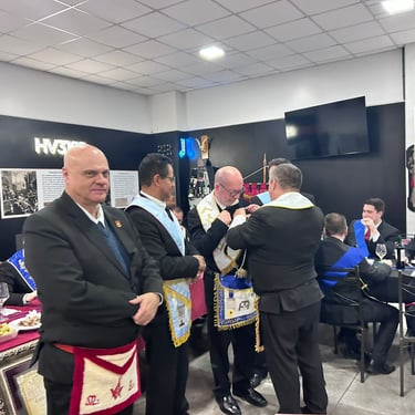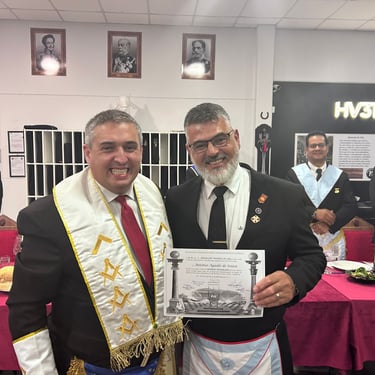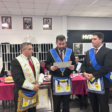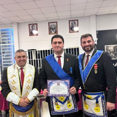 Ainda durante o evento, diversos Irmãos foram agraciados com o pin da Loja, símbolo de pertencimento e reconhecimento, e foi realizada a diplomação pelo Venerável Mestre e pelo seu Padrinho, do Irmão Antônio Augusto S. Regalin como Mestre Maçom, marco significativo em sua caminhada iniciática.