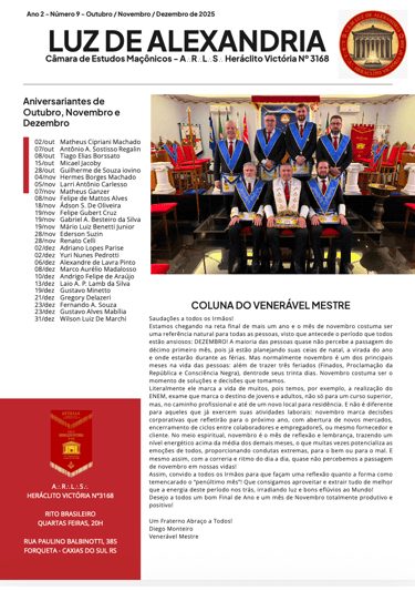 Esta edição especial de final de ano traz reflexões sobre o período. O Venerável Mestre, Diego Monteiro, relembra a catástrofe que atingiu o estado em 2024, elogia o trabalho de auxílio da Loja e incentiva o voluntariado para 2025. Os artigos incluem uma crônica de Eduardo Augusto Rocha sobre a busca pela "verdadeira luz" e a importância da perseverança na Ordem. Outros textos abordam a transição da Ordem DeMolay para a Maçonaria como um "aprimoramento de propósito" , uma meditação sobre os símbolos natalinos do "Verbo" e da "Estrela" , e uma exploração do vinho como símbolo maçônico de transformação e comunhão fraterna.