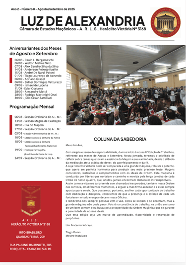 A edição reúne reflexões profundas sobre virtudes maçônicas, destacando a lealdade, a fé e o constante aperfeiçoamento moral como pilares essenciais da jornada iniciática. Explora simbolismos como a Escada de Jacó, a ligação entre Umbanda e Maçonaria e a luta diária entre o profano e o sagrado. Traz estudos históricos sobre o papel da Ordem na Revolução Farroupilha e a trajetória do Grande Oriente do Brasil. Aborda ainda a figura de São João Evangelista como símbolo de contemplação, sabedoria e renascimento da Luz. Complementam a publicação a programação da Loja, aniversariantes do período e os trabalhos da Câmara de Estudos Maçônicos.